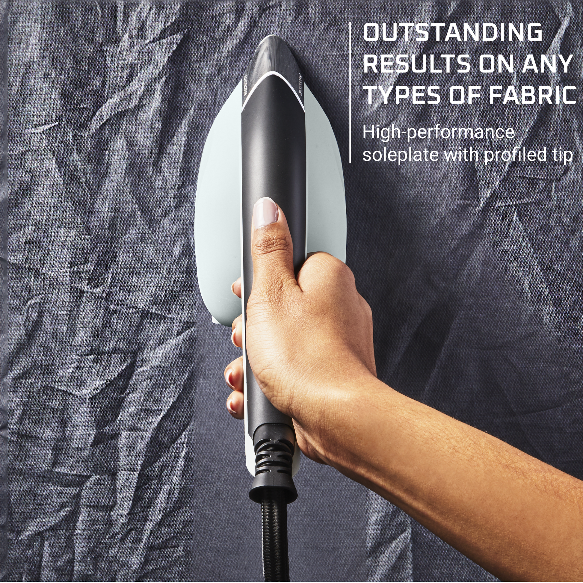 - Kết quả hiệu quả trên mọi loại vải ủi được, cả ủi đứng và ủi ngang, với đầu bàn ủi được thiết kế để ủi đến những vùng khó ủi.