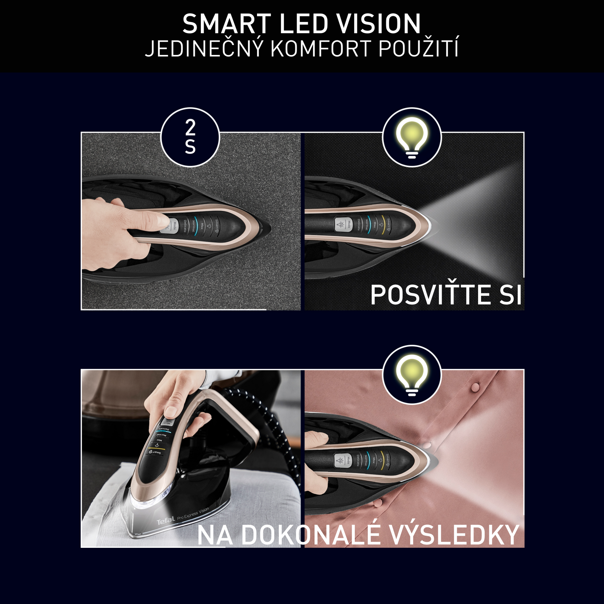 - Tầm nhìn LED thông minh: Đèn LED ở đầu bàn ủi tự động chiếu sáng hướng đến kết quả ủi hoàn hảo