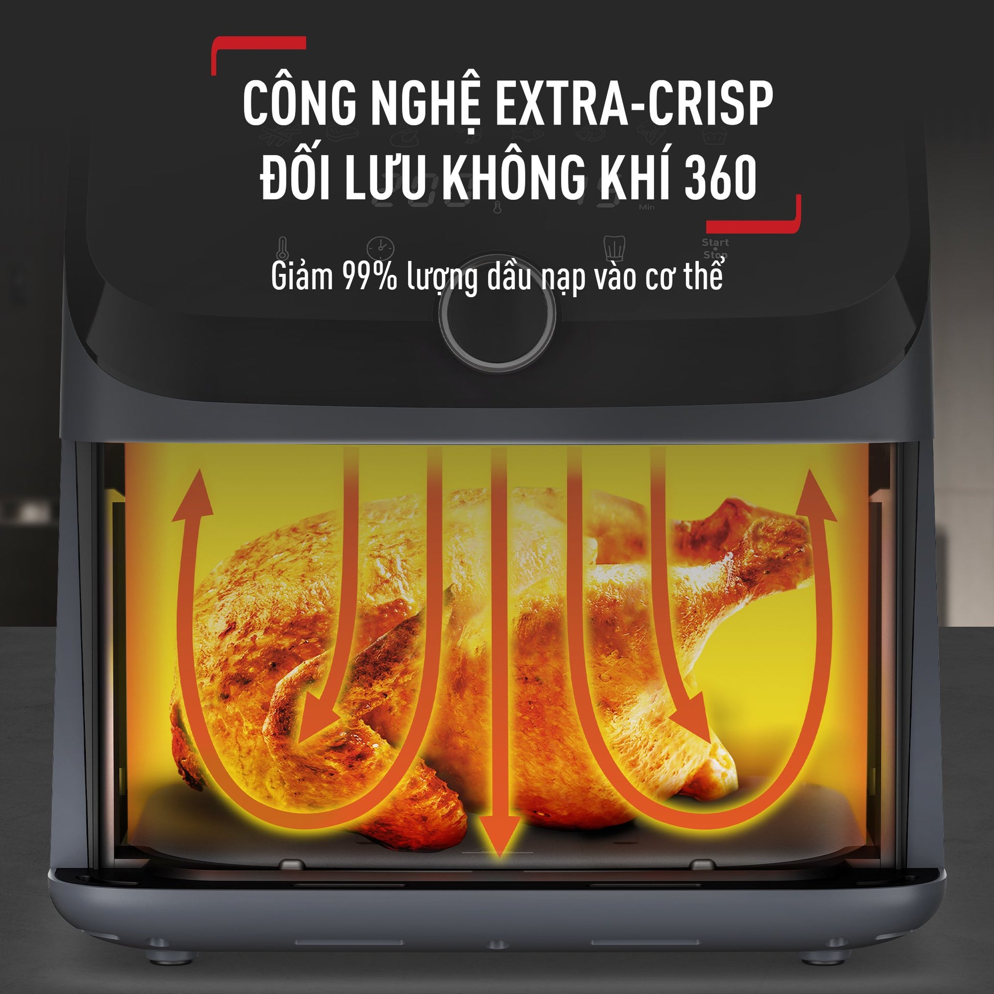 - Công nghệ Extra-Crisp cho món ăn giòn tan, vàng ươm với ít hoặc không cần thêm dầu—giảm 99% lượng chất béo so với nồi chiên ngập dầu*
