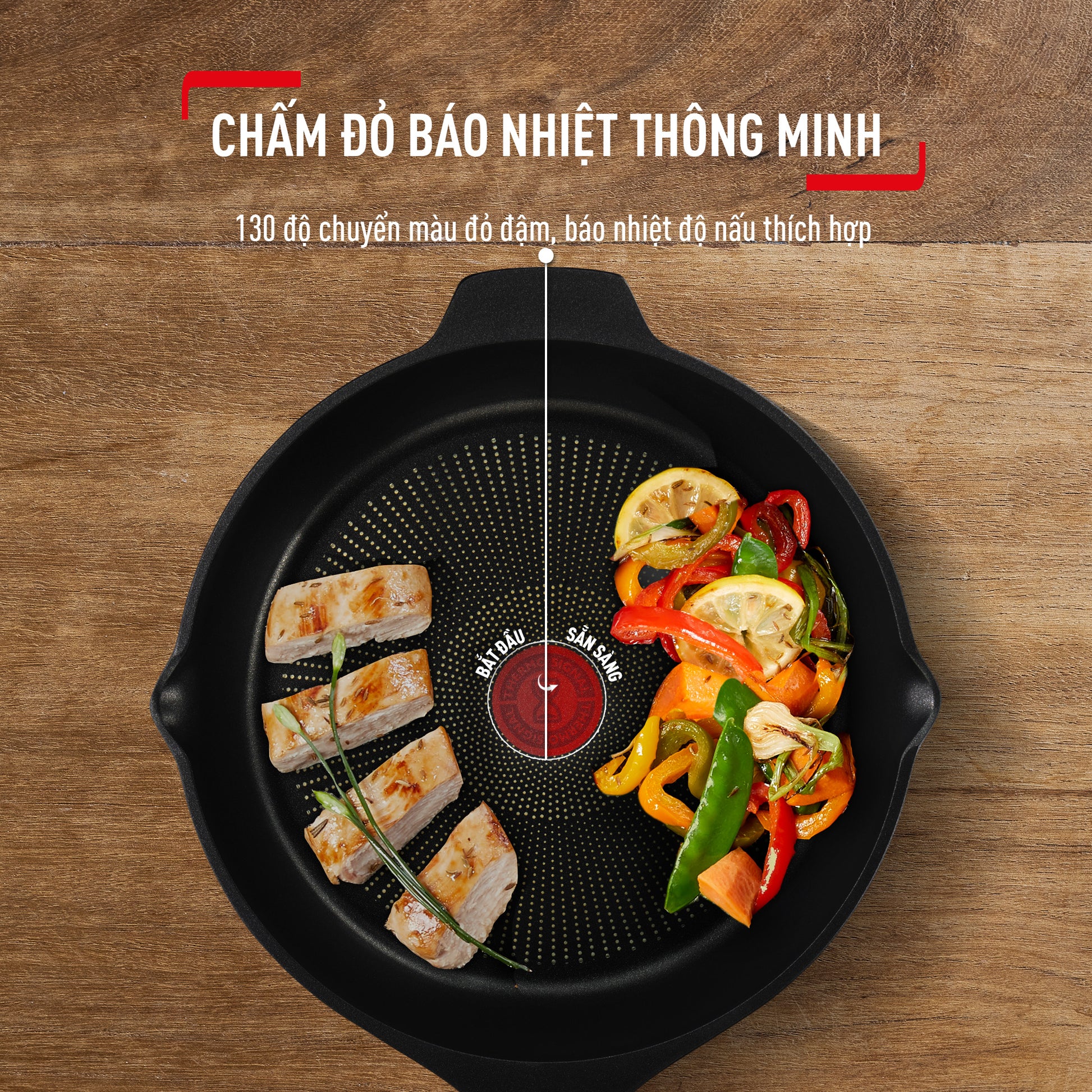 - ĐÈN BÁO NHIỆT: Vùng Thermo-Signal™ cải tiến đổi màu khi đến lúc bắt đầu nấu, giúp món ăn chín đều hoàn hảo mỗi lần.